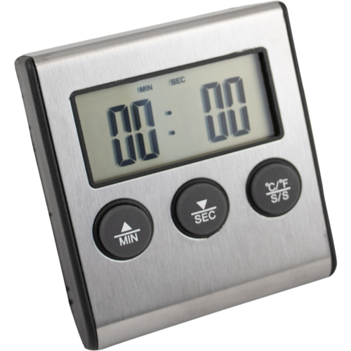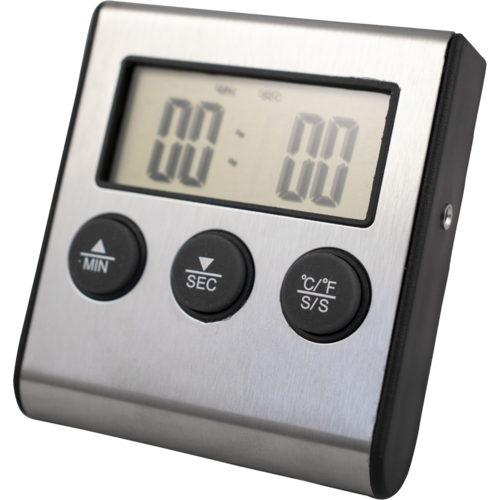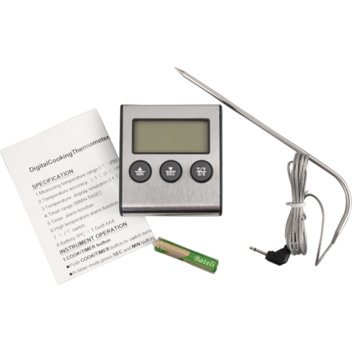 Simple and easy to use probe thermometer with alarm. The cable on this thermometer isn't waterproof so you shouldn't allow the probe to be fully submerged. If this does occur and you are getting incorrect readings you can place the probe in the oven (leaving the plug outside) and bake for 1 hour at 190C to boil the moisture out of the probe.
