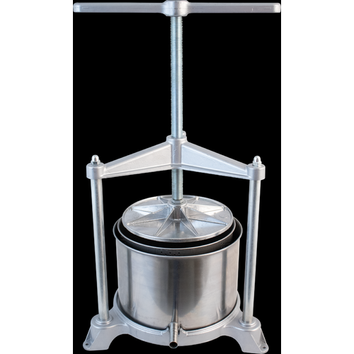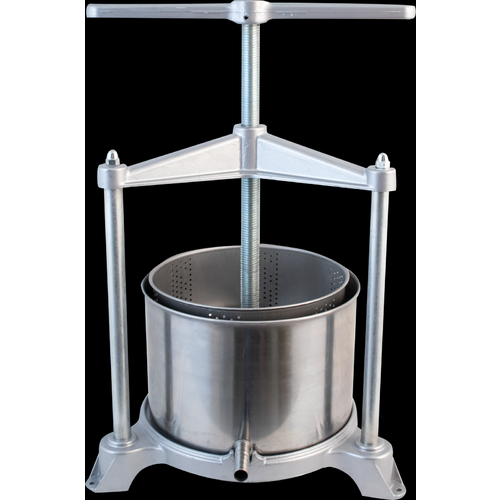Our Large Fruit Press is great for pressing small quantities of fruit, herbal tinctures, butter, cheese, and more. The stainless steel perforated basket keeps the product in, while the outer basin with pour spout directs the liquid to your collection container. The perforated basket and outer basin are made of stainless steel. The pressing plate and base are made from aluminum.