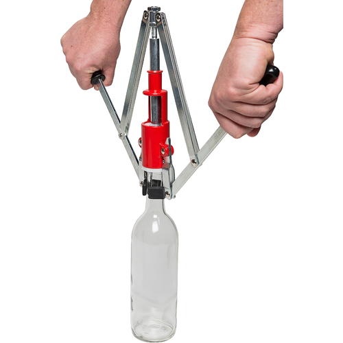 Twin lever corker for corking wine bottles. Spring mechanism holds neck of wine bottle tight during cork insertion. Place cork in chamber and lower handles. Adjustable cork depth.